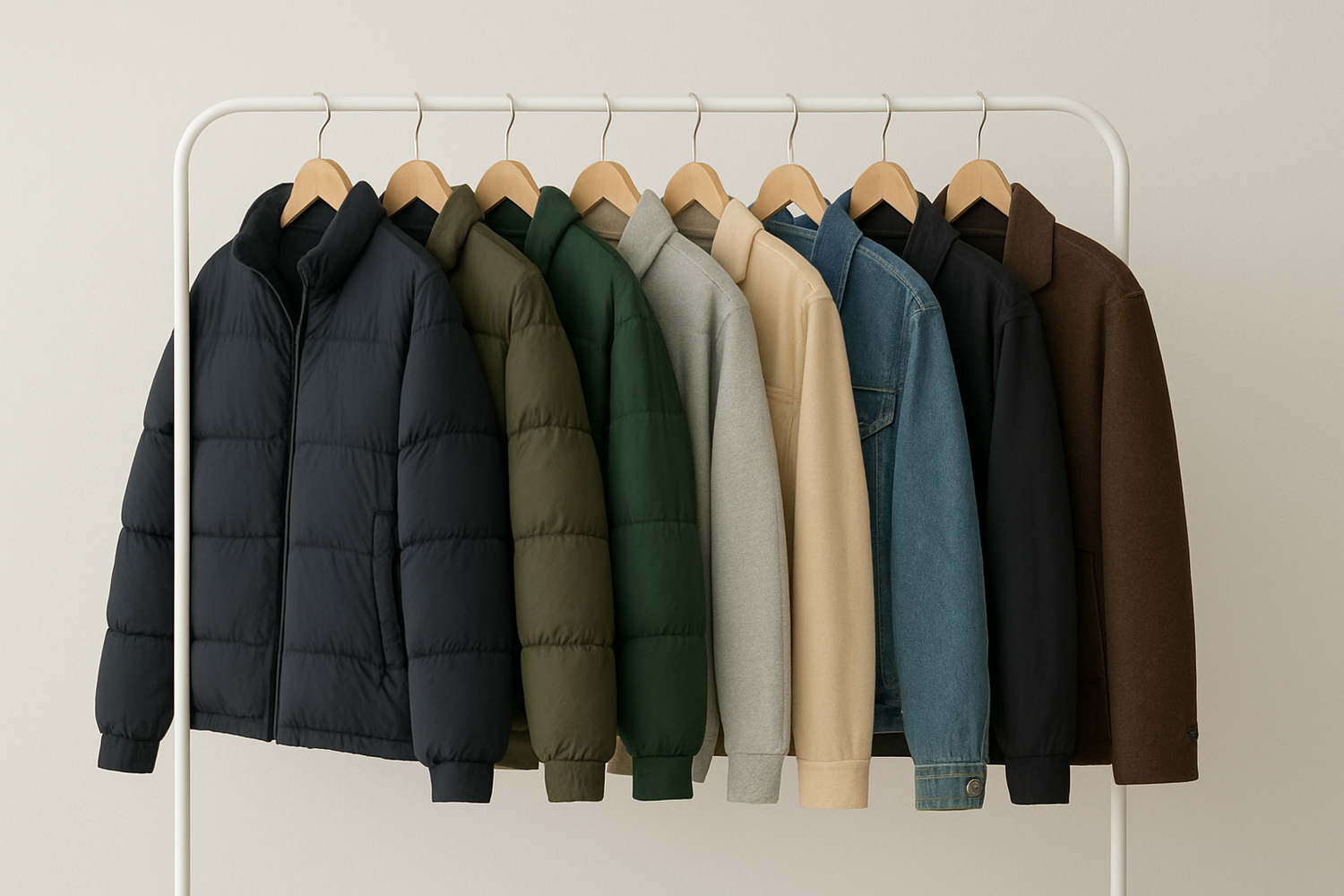 Upgrade your wardrobe with our versatile unisex jacket collection, designed to suit both men and women. Displayed on a modern clothing rack, this collection features a variety of styles including puffer, bomber, denim, casual, and wool jackets. Each piece is crafted for comfort, durability, and everyday wear, making them perfect for all seasons.
