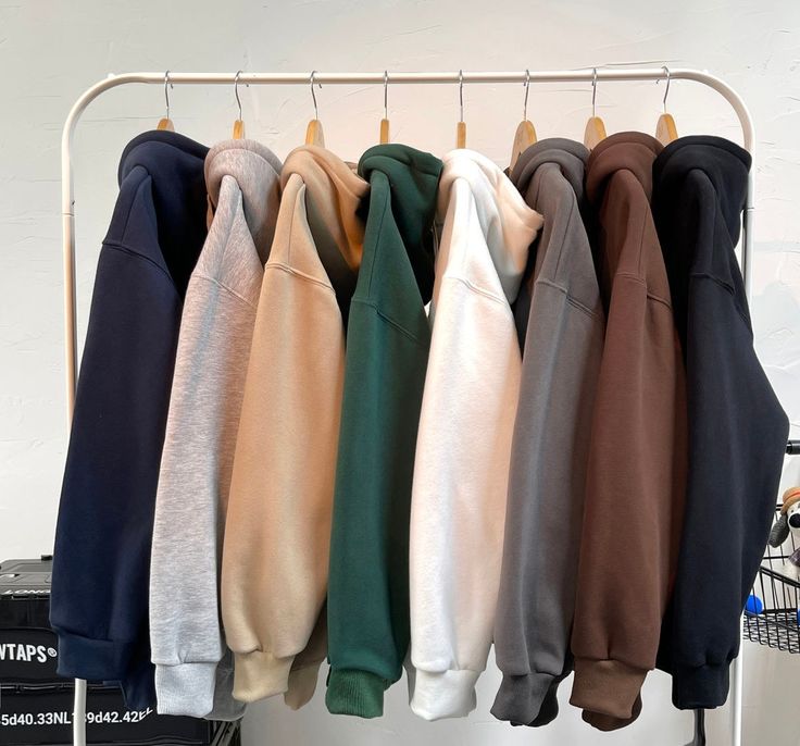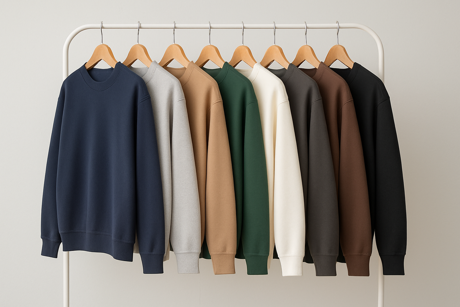 Discover our premium crewneck sweatshirt collection, designed for comfort and timeless style. Displayed on a minimalist rack, this collection features eight versatile colors: Navy Blue, Light Grey, Beige, Forest Green, White, Charcoal, Brown, and Black. Each sweatshirt is crafted from soft, high-quality fabric with ribbed cuffs and hem, offering a relaxed fit perfect for everyday wear.